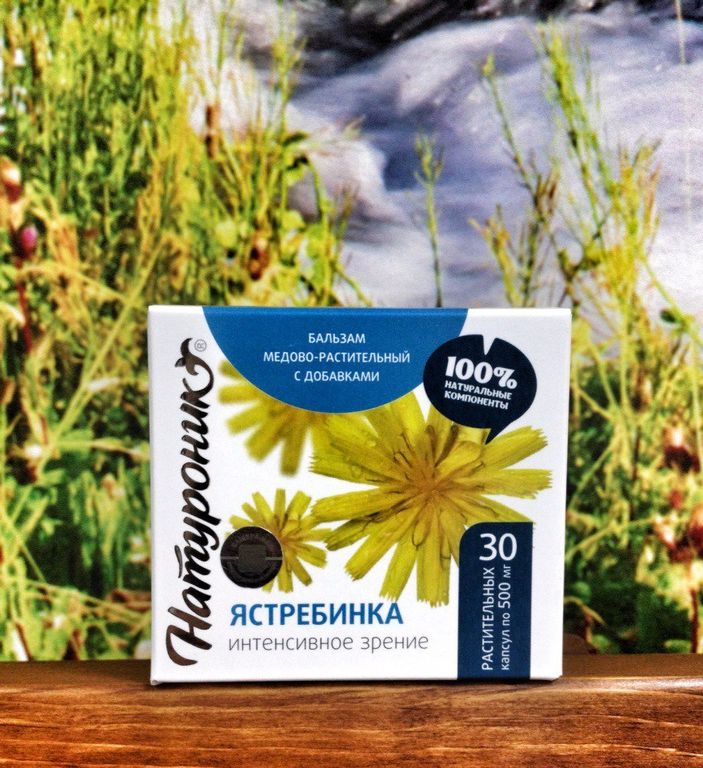 Растительный комплекс «Натуроник® ястребинка» «Сашера-Мед» – сочетание природных компонентов на основе травы ястребинки и ягод годжи, которое оказывает интенсивное восстанавливающее действие на органы зрения и препятствует нежелательным изменениям.