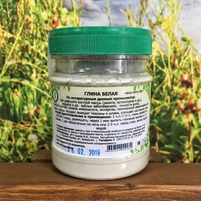 Способ применения и приготовления: 1ч.л.-1 ст.л белой глины развести в 100 -200 г воды,