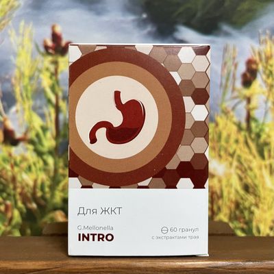 «G. mellonella – INTRO» - эффективное средство для профилактики и оздоровления ЖКТ, имеющее в составе широкий спектр натуральных биологически активных веществ, которые оказывают противовоспалительное, спазмолитическое, обезболивающее и антисептическое действие, способствуют восстановлению кровообращения, питания, регенерации и рубцеванию тканей, восстановлению нормальной микрофлоры и устранению дисбактериоза. Гранулы способствуют снятию спазмов с кишечника и желудка, болевых симптомов при воспалении, восстановлению повреждений слизистой, остановке кровотечения, в том числе при язвенной болезни, укреплению сосудов и капилляров, созданию защитного барьера на слизистой и воспрепятствованию проникновению бактерий.