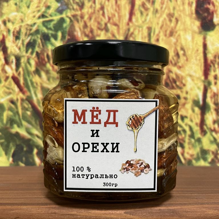 Состав: мёд акация, грецкий орех, фундук жареный, миндаль жареный, кешью жареный